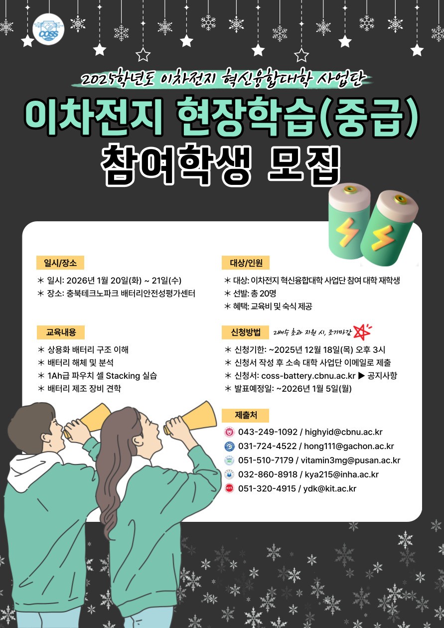 [모집 중] 2025학년도 이차전지 현장학습(중급) 참여학생 모집 (~12/18)